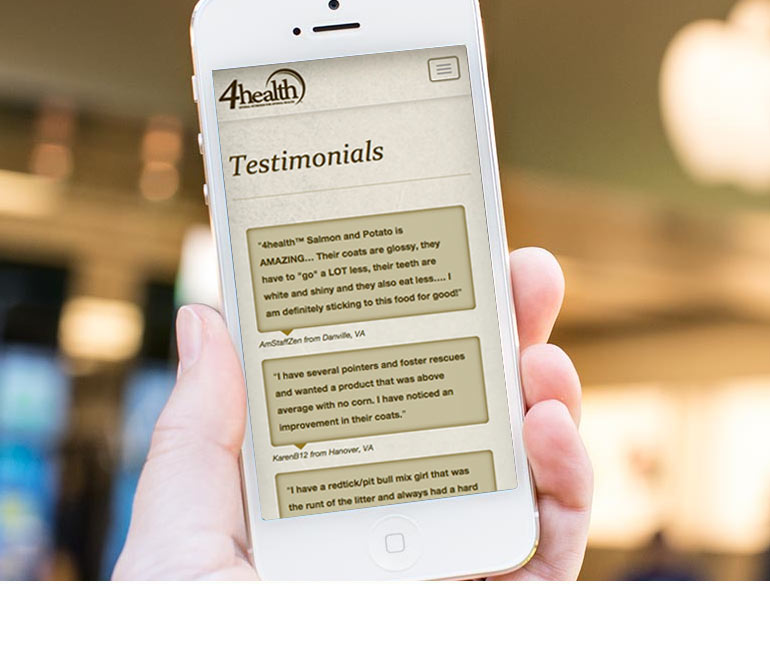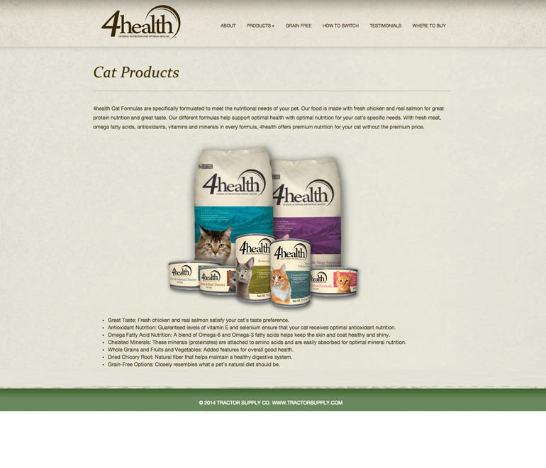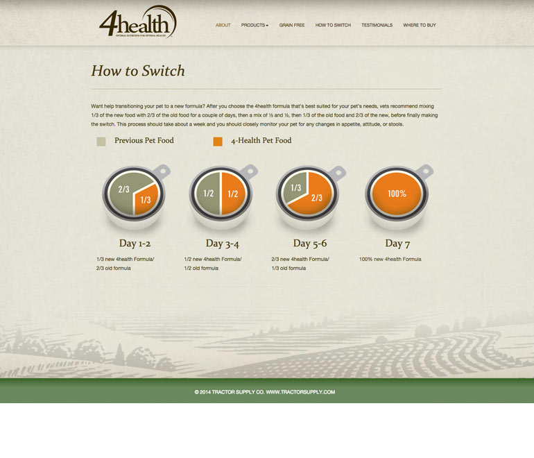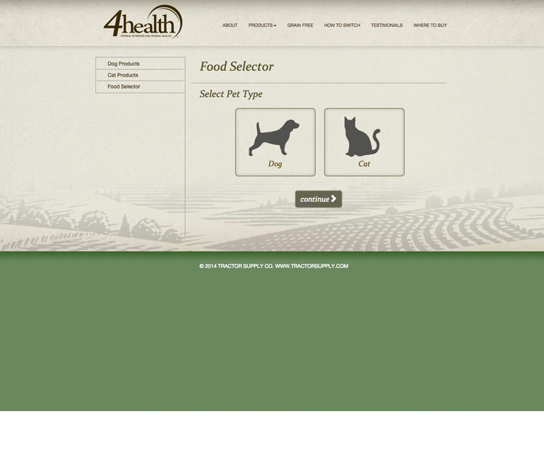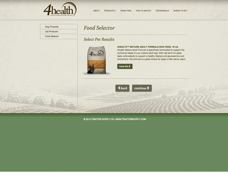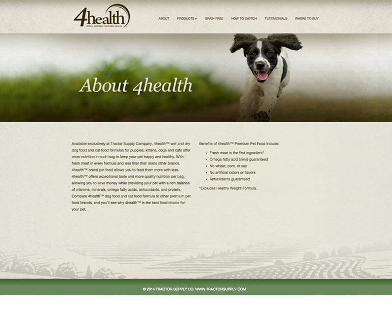4Health is Tractor Supply’s exclusive brand of premium pet food. We created a site to support the brand, assist customers in selecting the right formula via a custom-built pet food selector, and explain how to properly transition their pet to a new food. The site is language-independent and can run on any system. It is also mobile responsive.