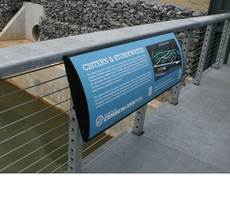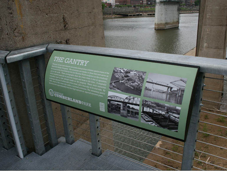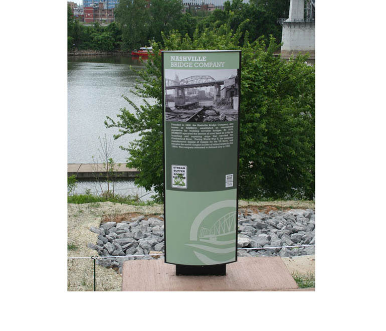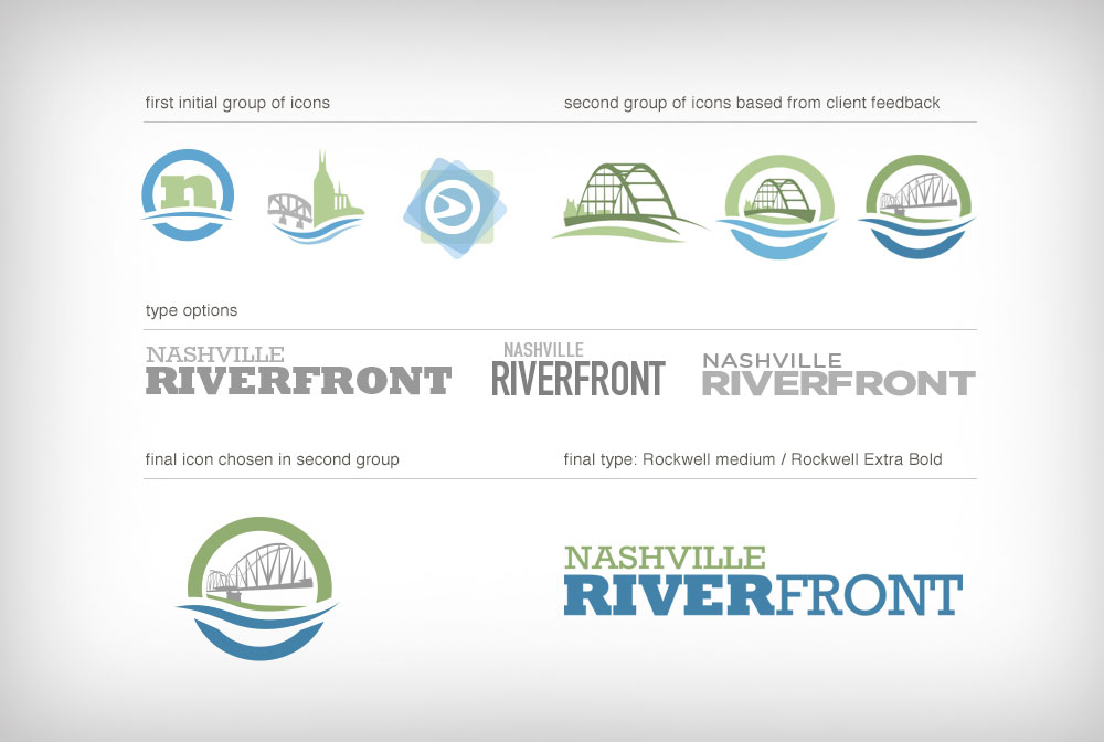 Many marks were submitted and there a lot of good options. However, the mark that was chosen met the approval of Metro Parks, MDHA, several focus groups and the Mayor. The color selections were a big part of the process for the brand. Naturally, blue represents water. However, green communicated the new landscape's connection with the water and the environmentally minded strategy of the construction. The bridge is used to connect both sides of the river together.