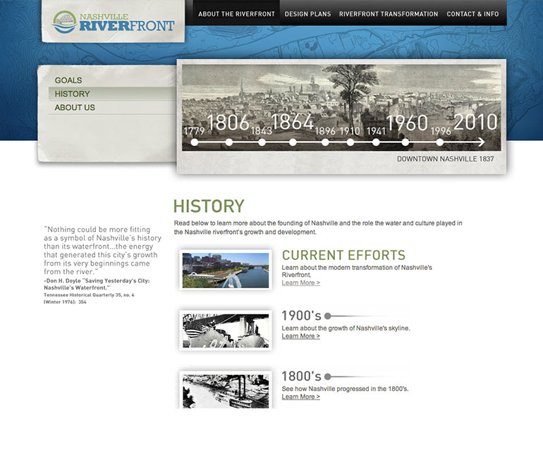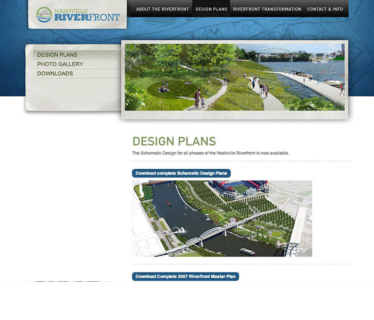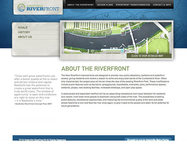 Mayor Karl Dean, Metro Parks, and MDHA had a vision a few years ago to transform Nashville's Riverfront and reconnect the city to the river. A plan began to take shape in 2009. After it was presented, Hargreaves & Associates contacted us and we started working on helping them brand this initiative.