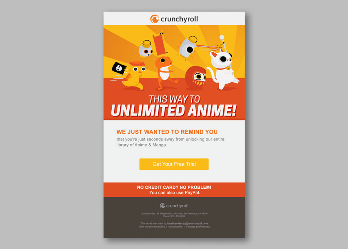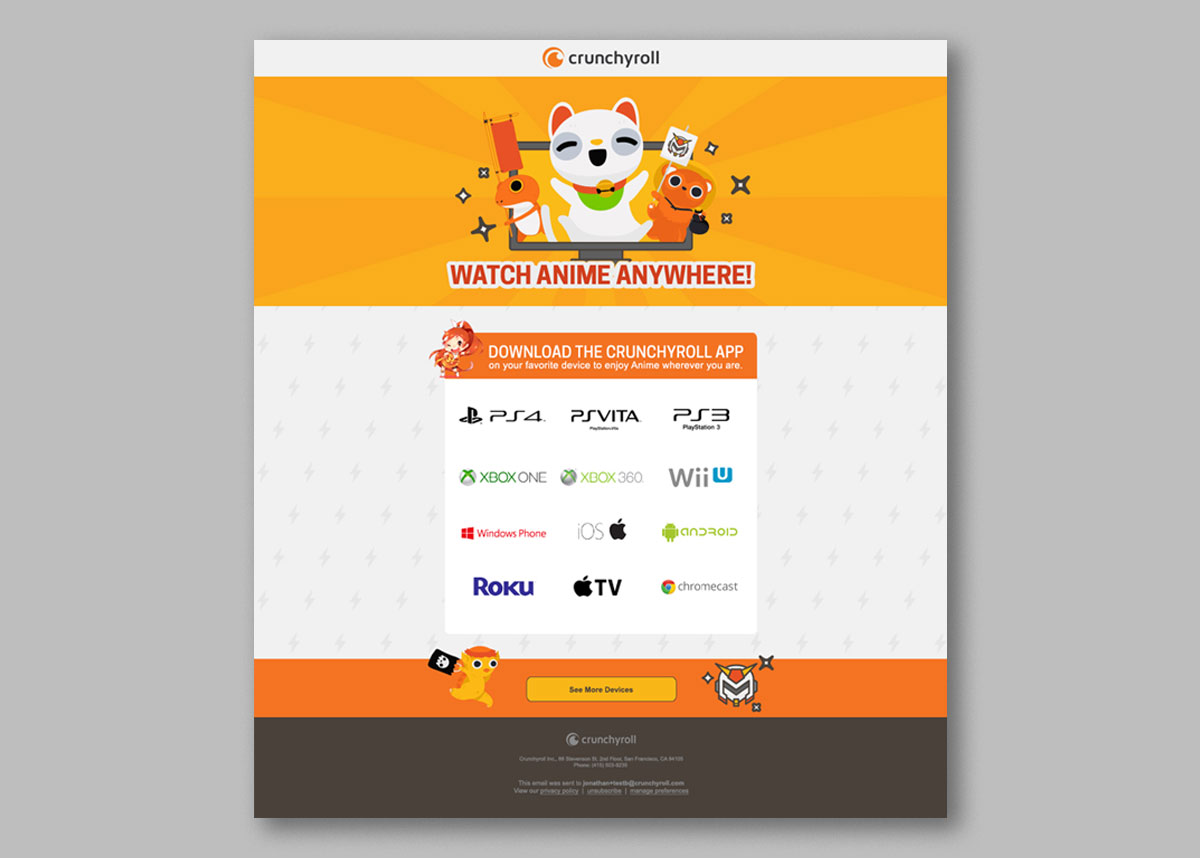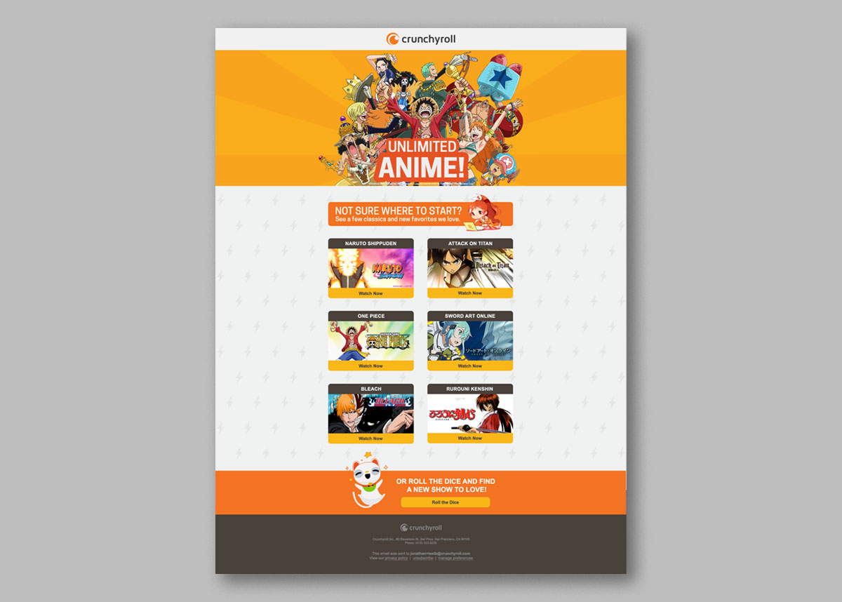 For Crunchyroll, the largest anime streaming service in the USA, Blue Tractor designed templates for their newsletters and social media communication.