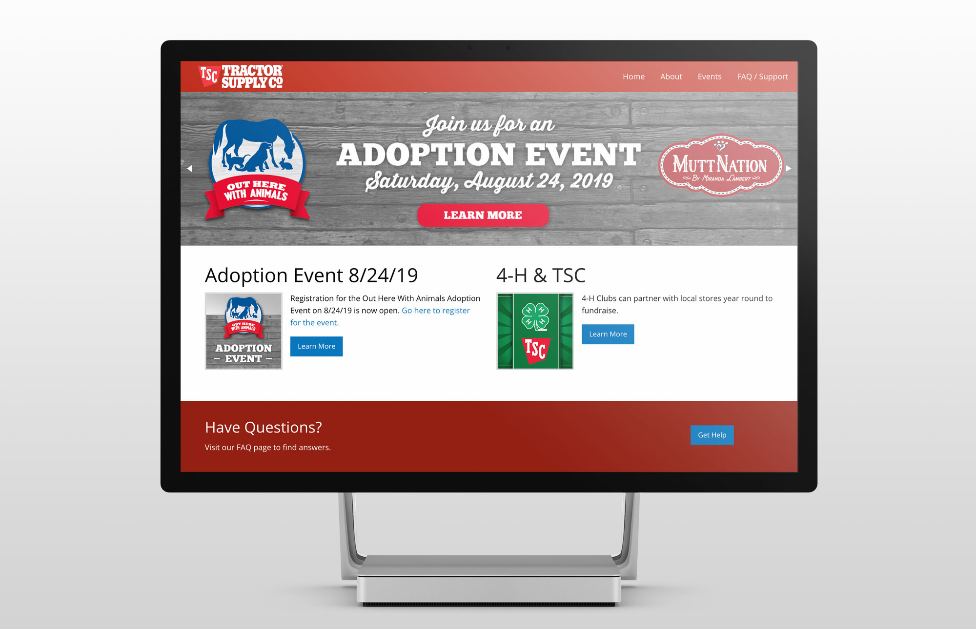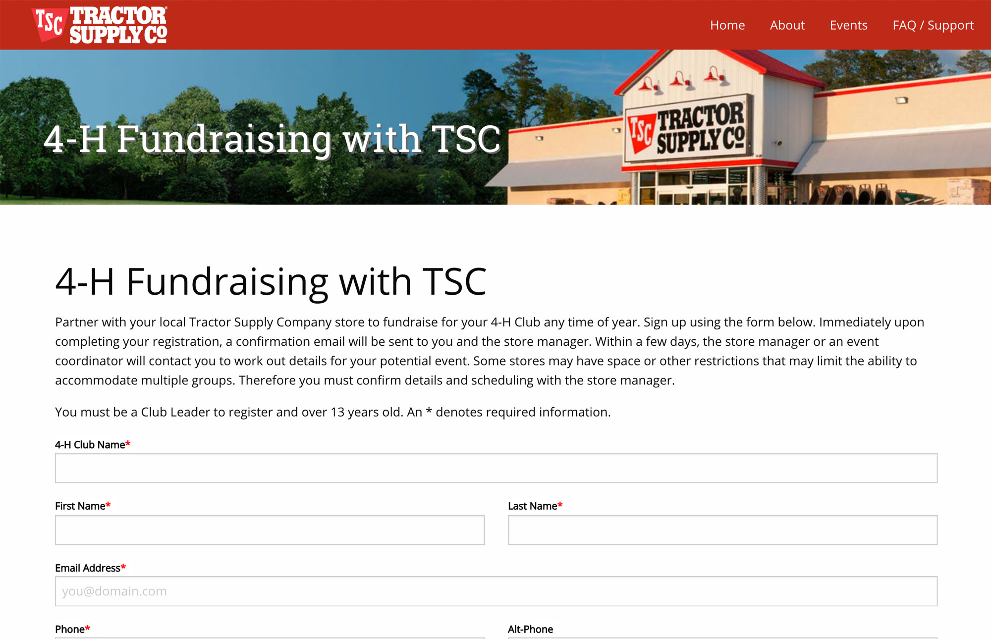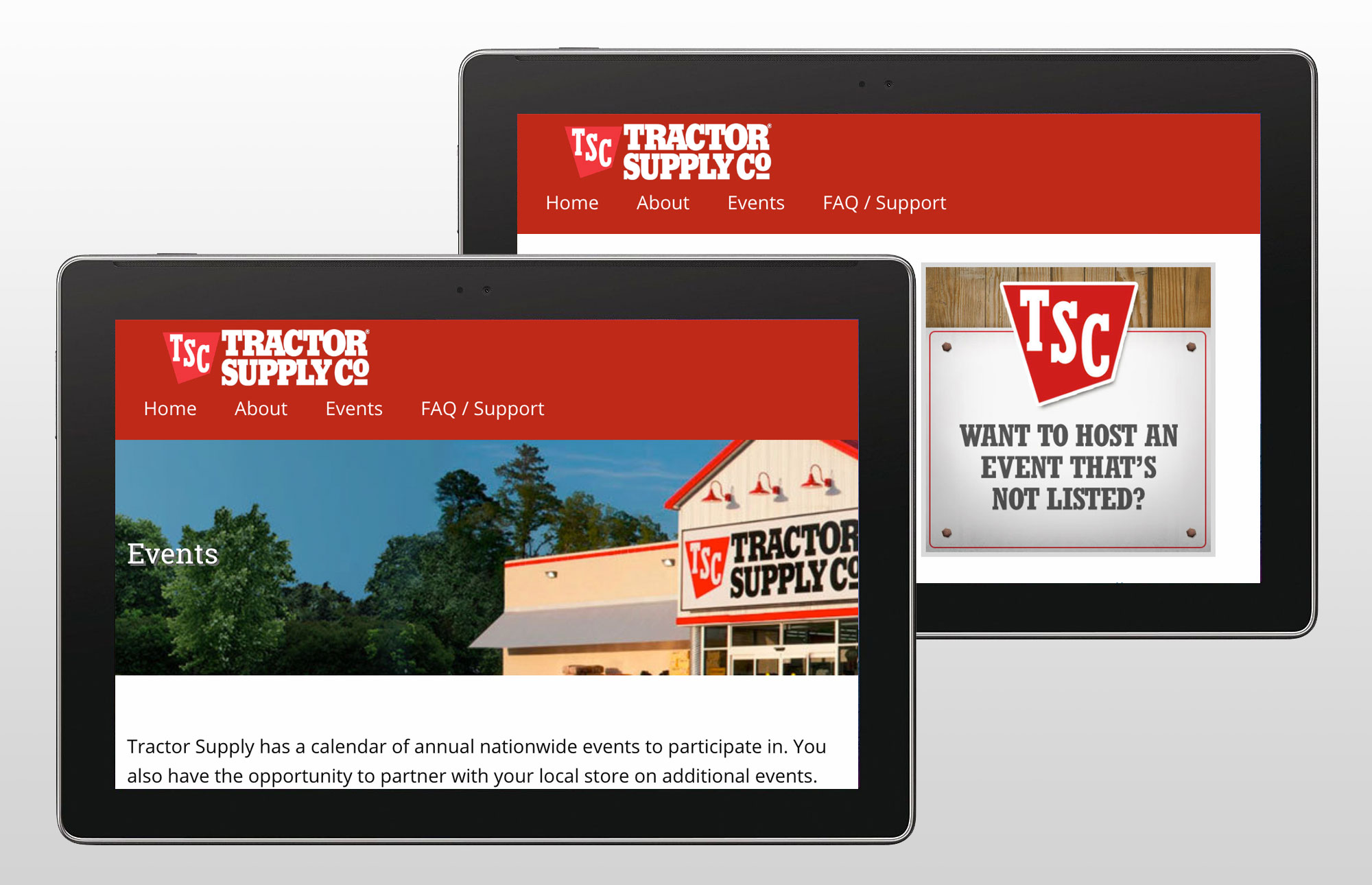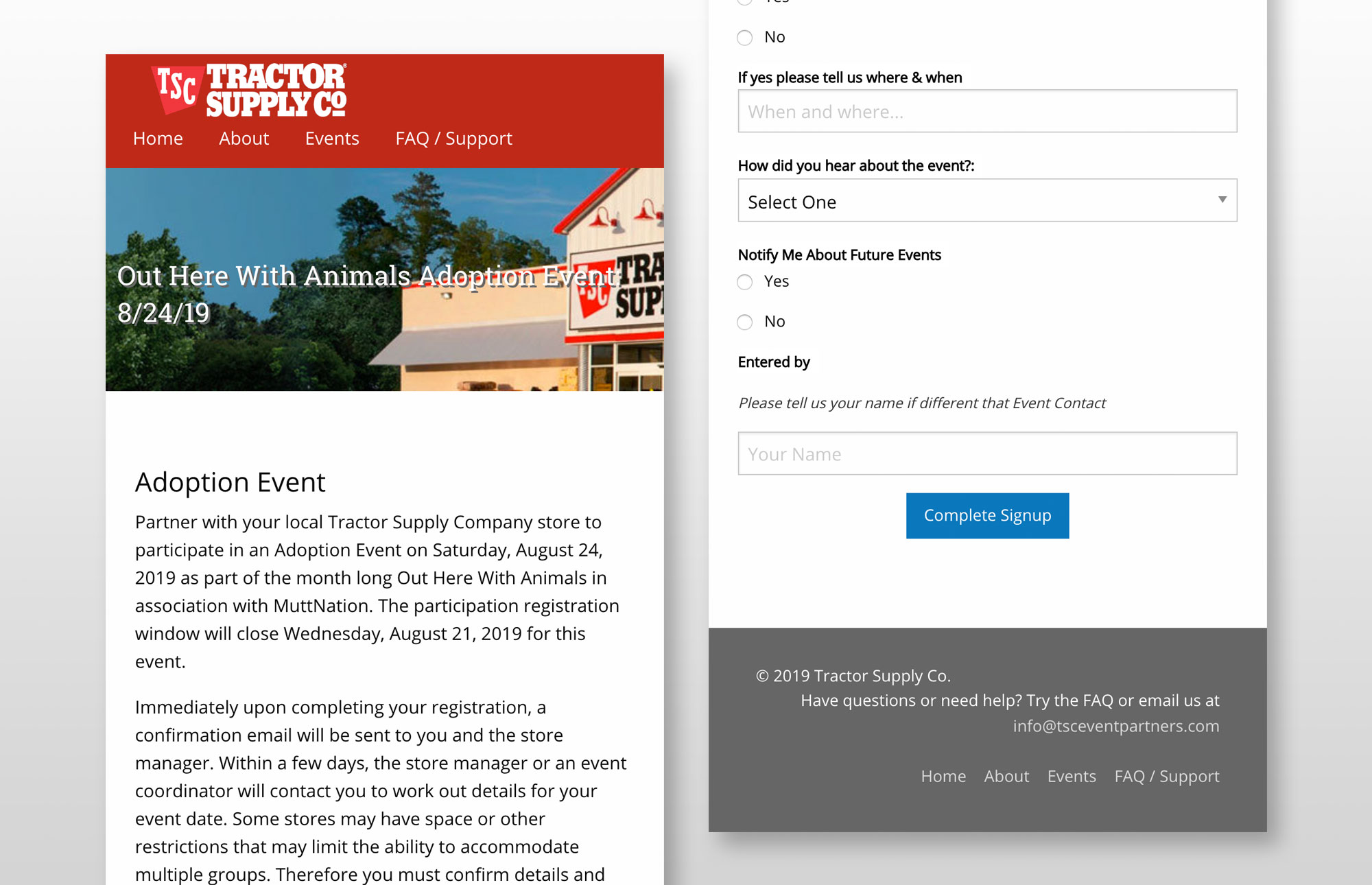 Keeping with Tractor Supply Company's philosophy of service to their communities, TSC actively recruits event partners to participate in local and nationwide events in their stores, such as pet adoptions and farmers' markets. On this site, potential partners can register availability to participate in TSC events. Stores have an internal tool for managing their submissions for events also designed by Blue Tractor.