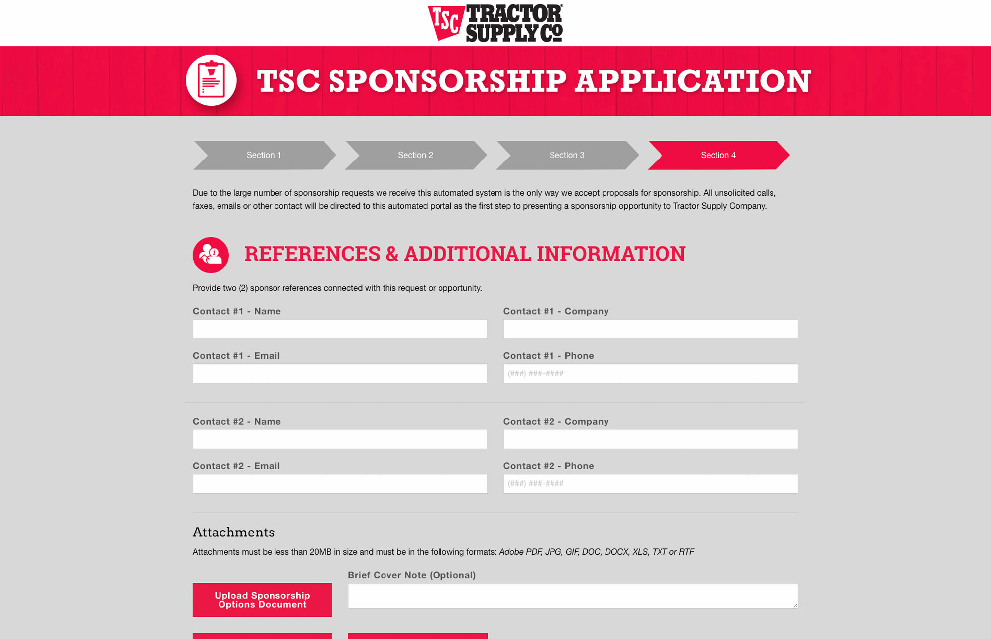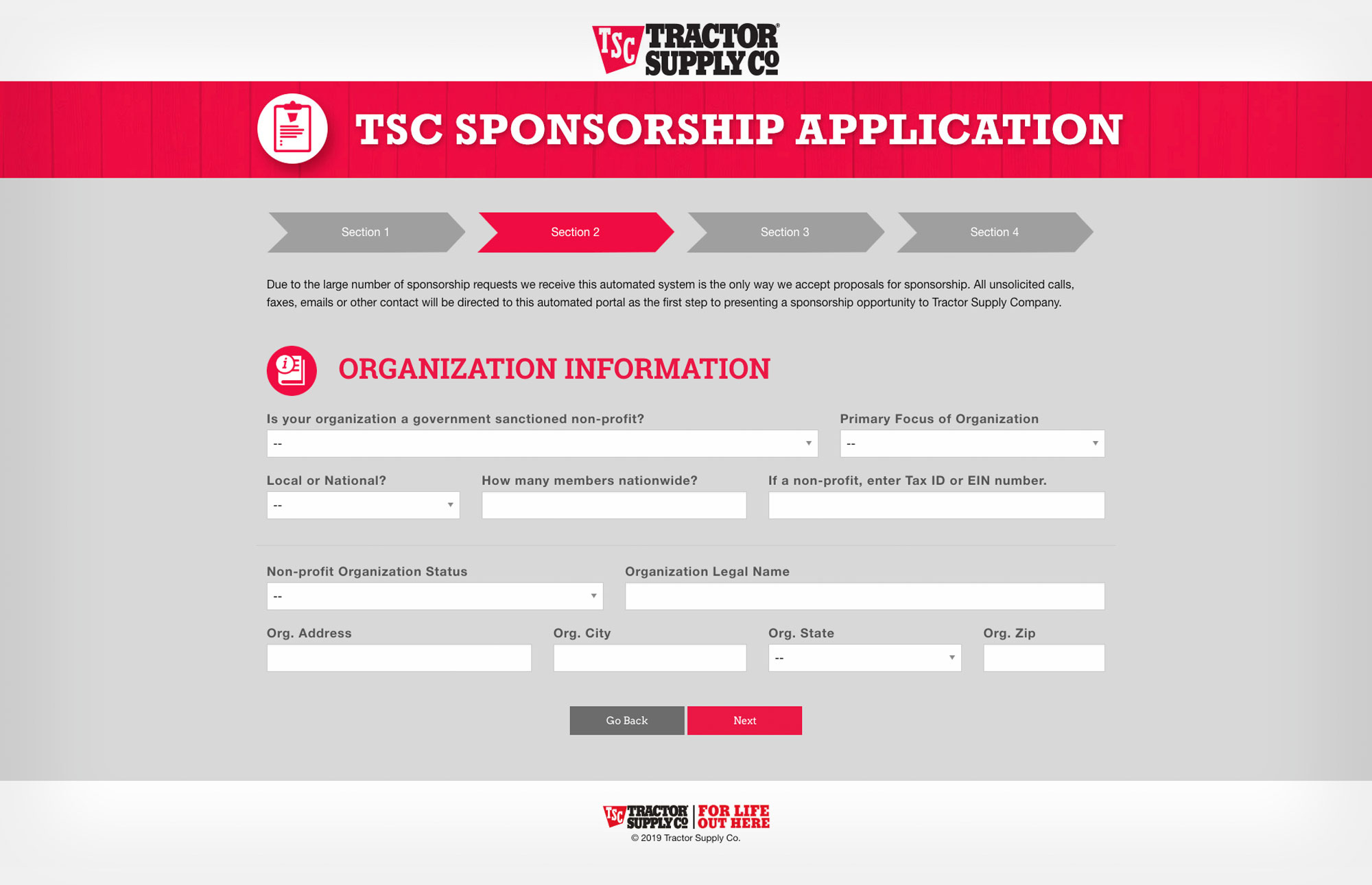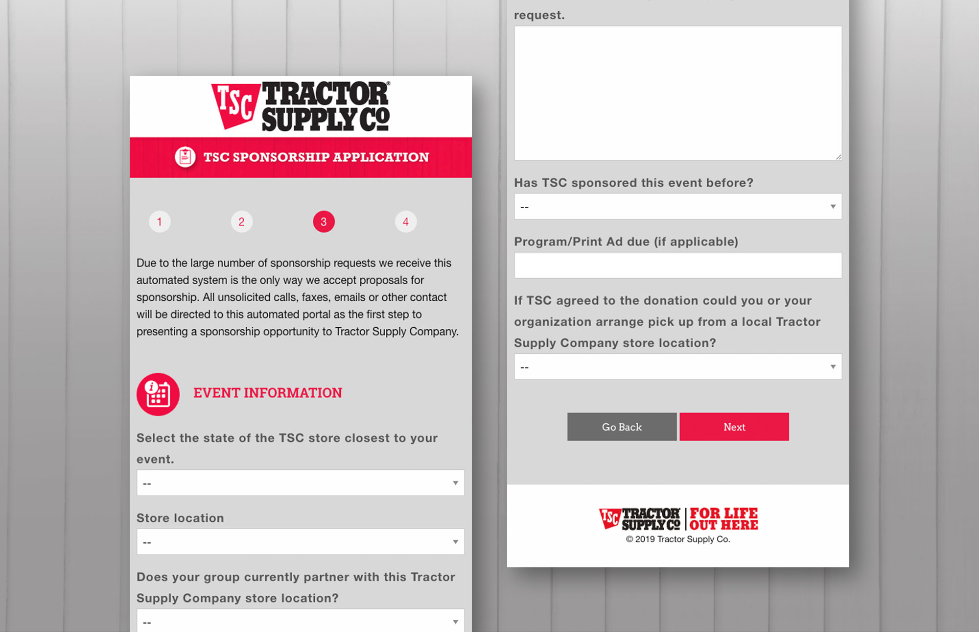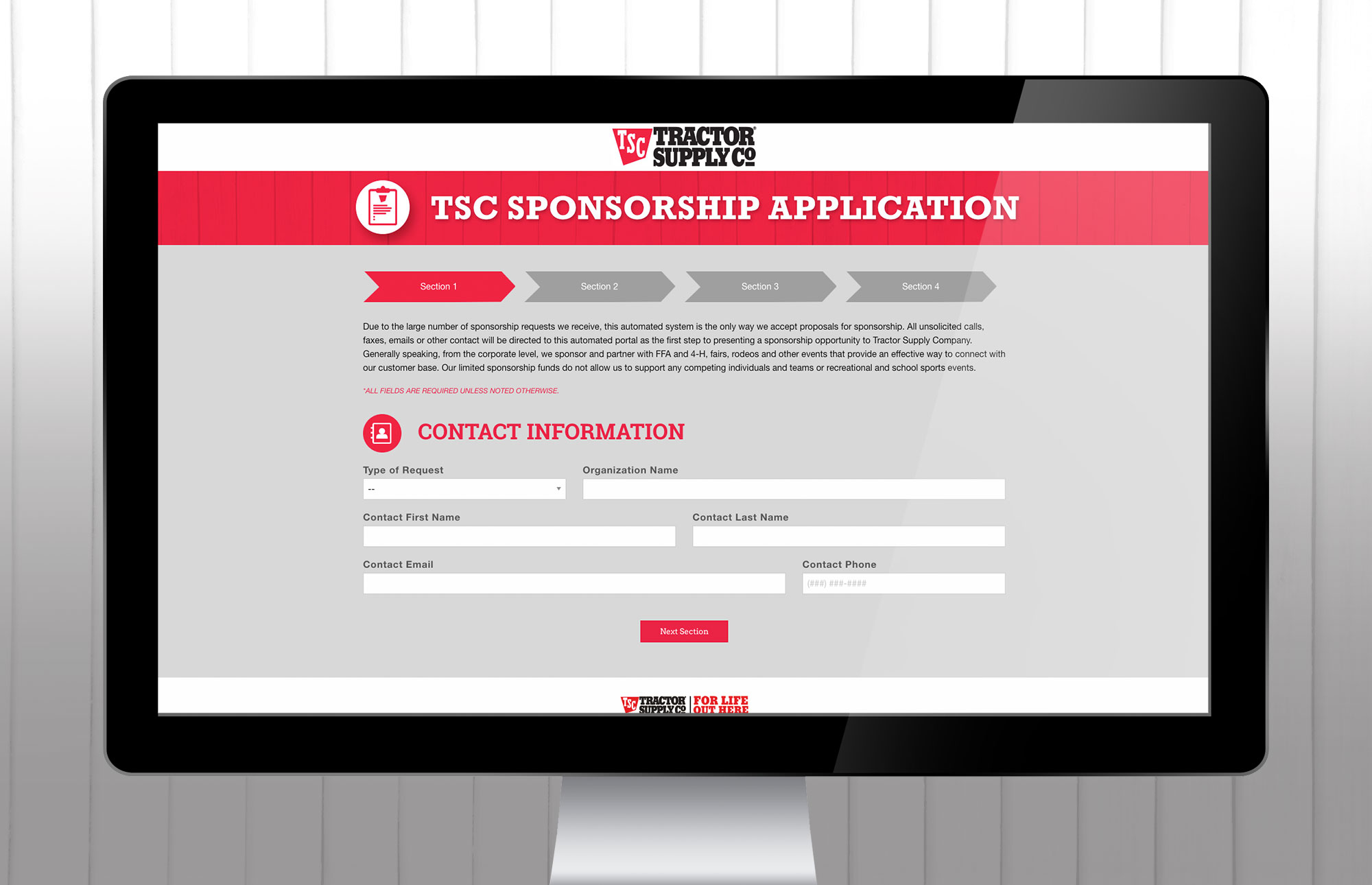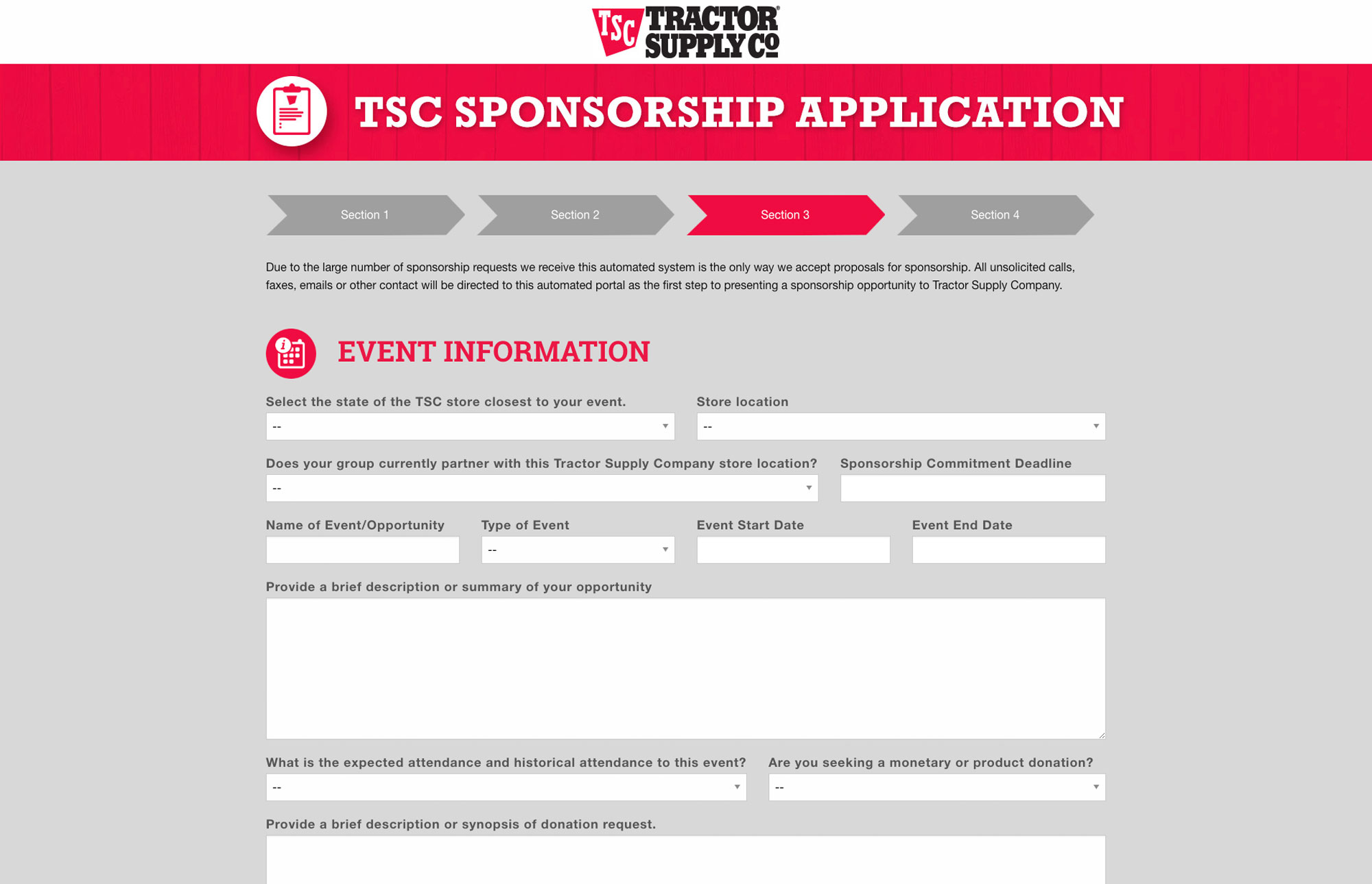 Tractor Supply Company needed a way to collect, evaluate and manage the many sponsorship and donation requests they receive each year. This site has a simple front end form used by the public for all such requests. A robust administrative backend (not pictured) provides tools for handling submissions--including evaluating and then accepting or declining requests--and then further managing accepted sponsorships. Budget tools, reporting and record management combine information that once encompassed many spreadsheets and documents into one manageable application. The result is faster response time, clear understanding of where money is being allocated which has improved time management for the project's team members.
