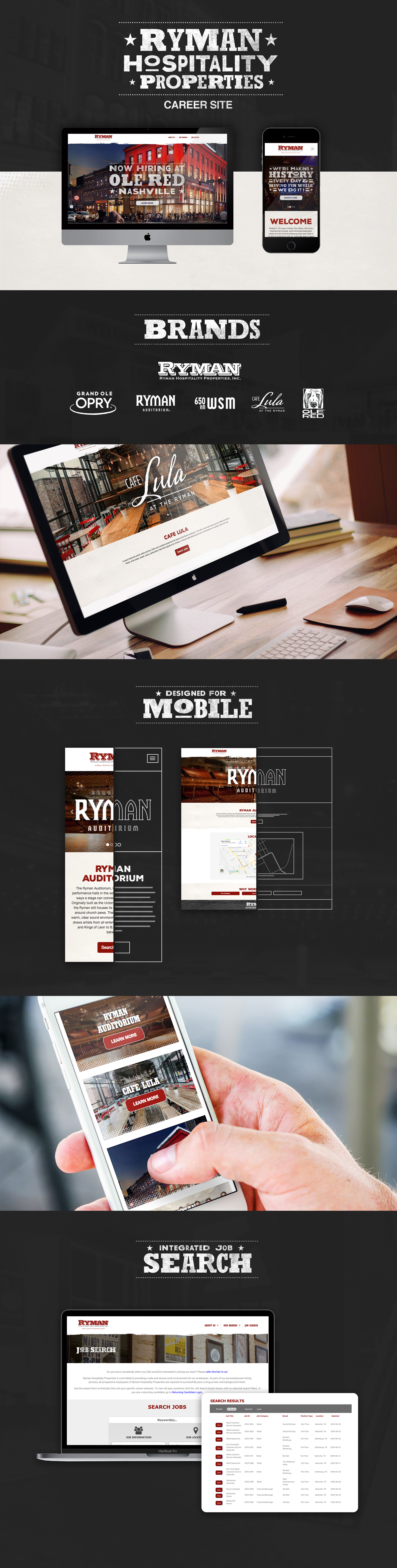 We redesigned the full RHPCareers site where job postings for world known venues--such as Grand Ole Opry and Ryman Auditorium--are shared with the public. We designed a job search function to match the site's design, using API feeds from RHP's third party vendor to offer a cohesive site experience.